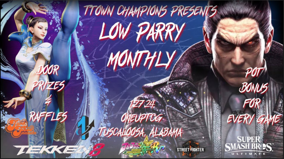 Coming up January 27 2024 in Tuscaloosa, Alabama. Sylanharp and TTown Champions Presents the: Low Parry Monthly which will feature the following games: JoJo’s Bizarre Adventure All Star Battles, Drive/Burn out Fighter 6 cough Street Fighter, Smash Bros Ultimate and of course Tekken 8There will be an added Pot Bonus for each game, Door prizes available and a 50/50 raffle.